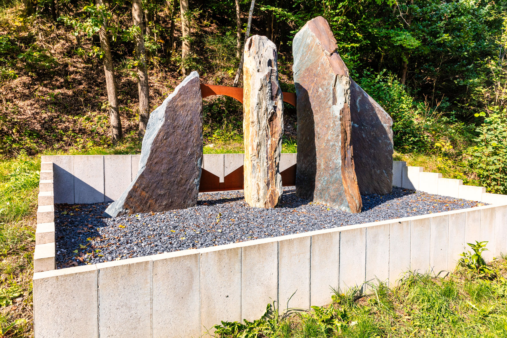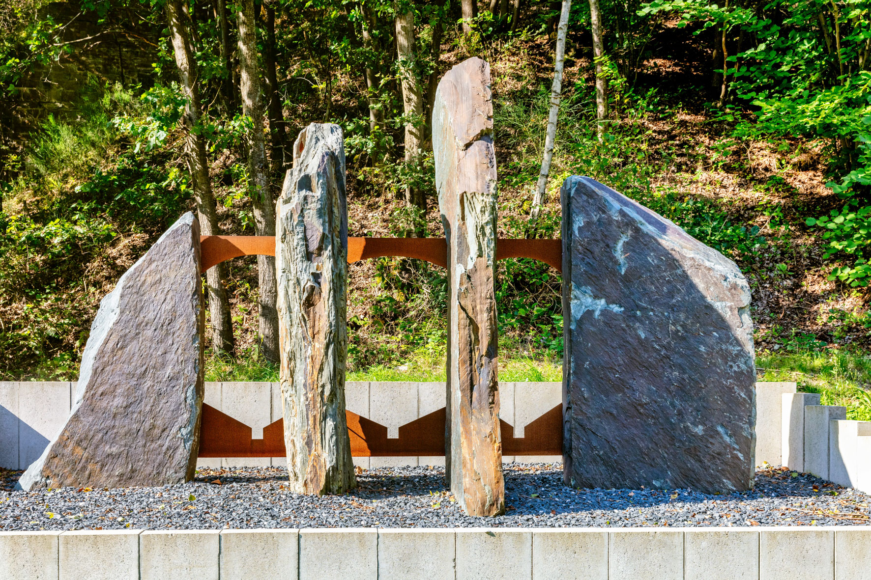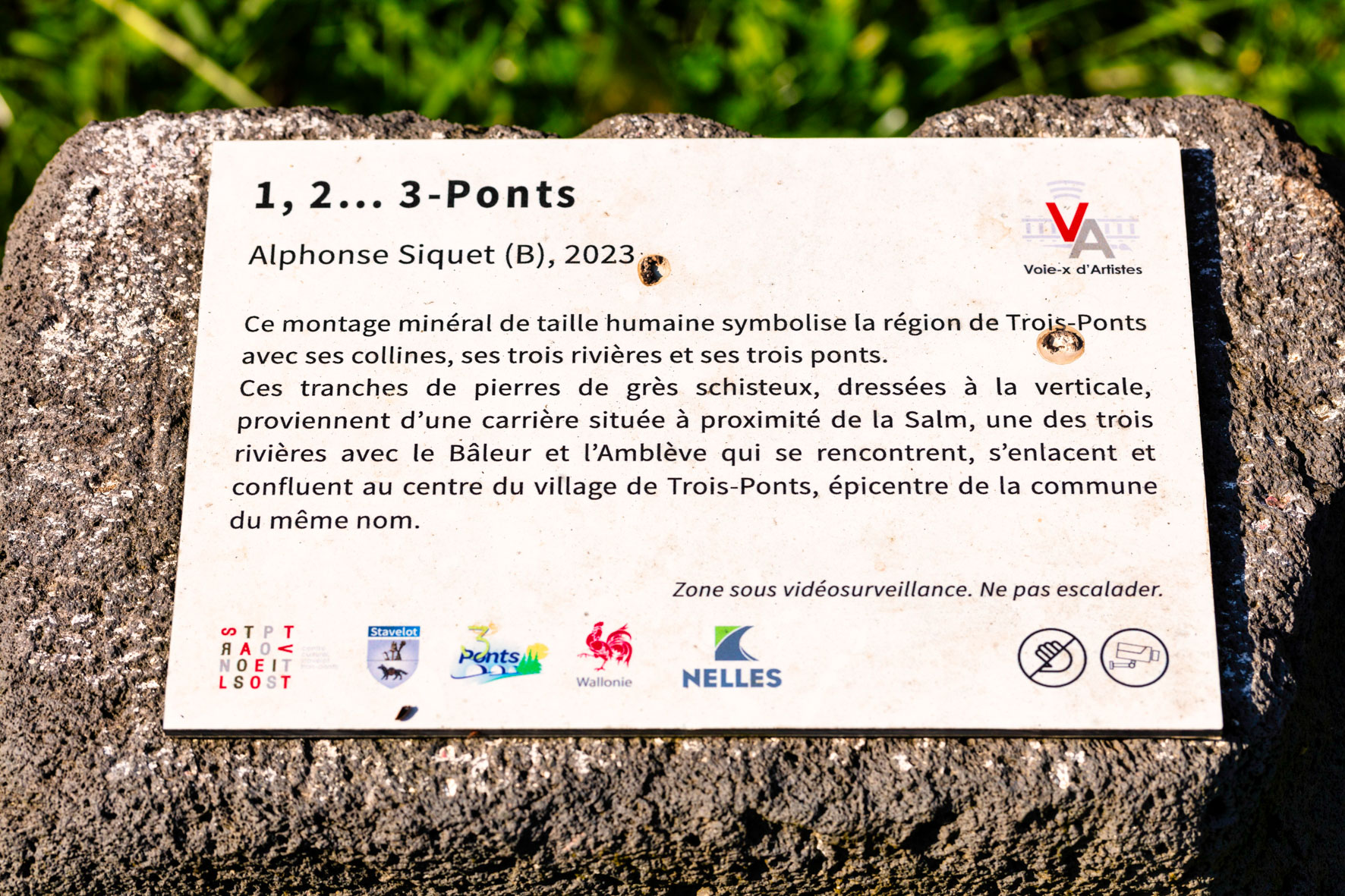 Montage minéral de taille humaine symbolisant la région de Trois-Ponts avec ses collines, ses trois rivières et ses trois ponts. Ces tranches de pierres dressées proviennent d’une carrière de la vallée de la Salm (Nelles Frères), une des rivières liées à la commune.