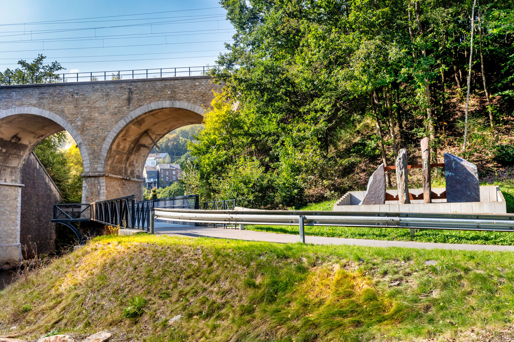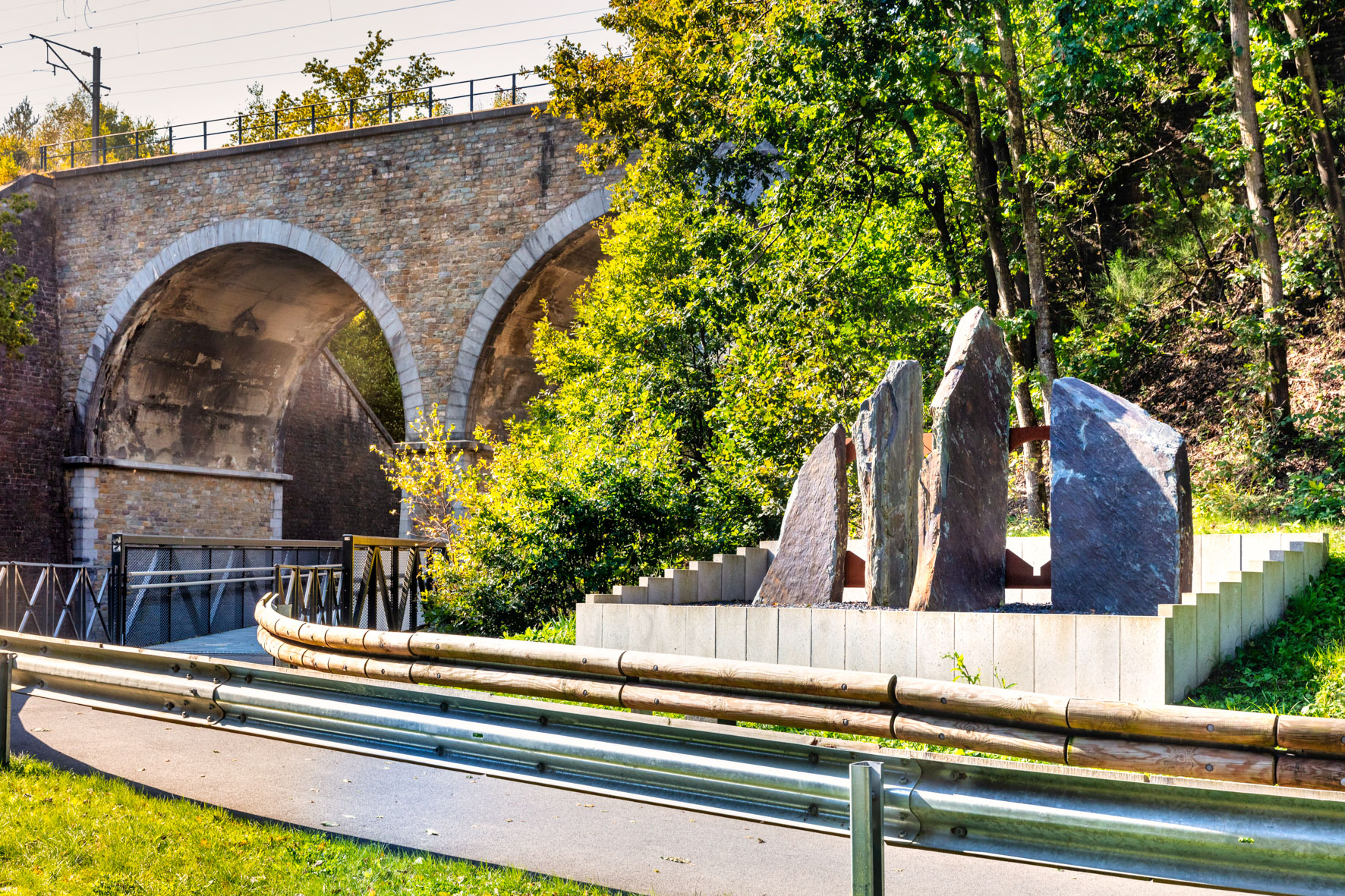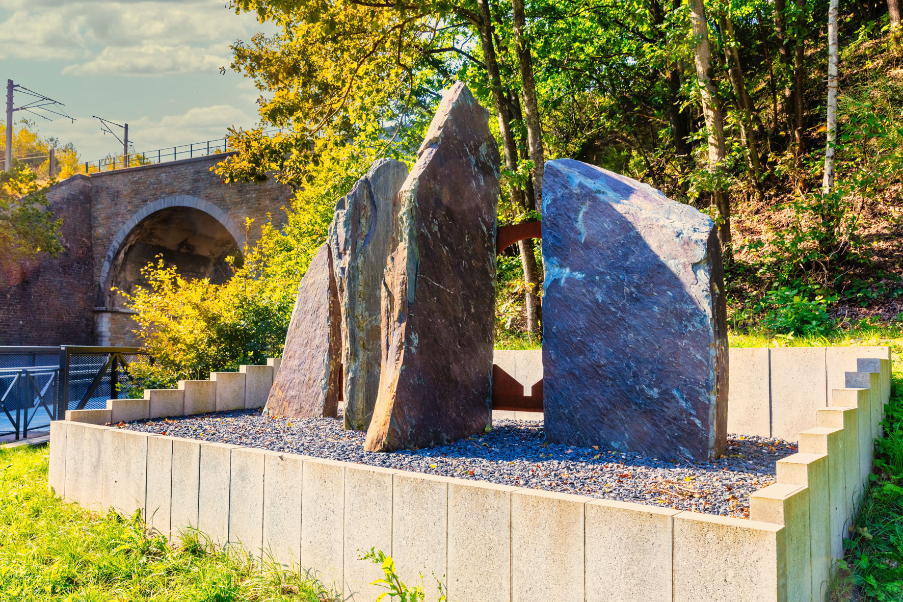 Montage minéral de taille humaine symbolisant la région de Trois-Ponts avec ses collines, ses trois rivières et ses trois ponts. Ces tranches de pierres dressées proviennent d’une carrière de la vallée de la Salm (Nelles Frères), une des rivières liées à la commune.