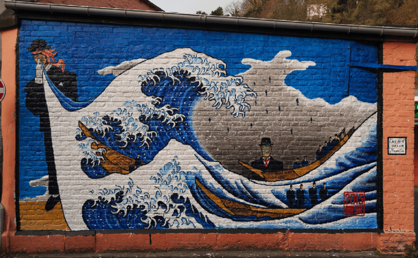 Ici, Magritte est présent un peu partout dans « la grande vague de Kanagawa », œuvre datant de 1831. Les tentacules sortant du chapeau sont également un clin d’œil à Hokusaï.