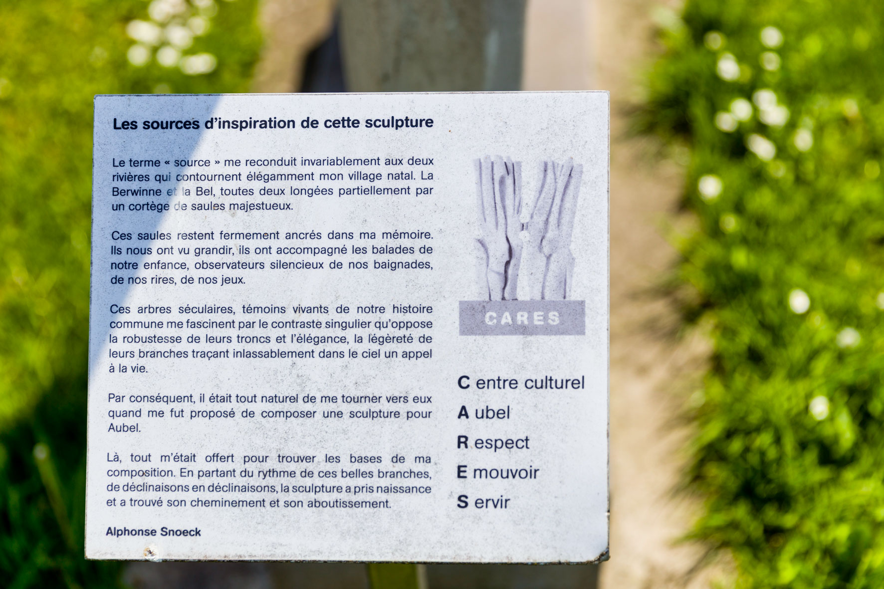 Ces arbres séculaires, témoins vivants de notre histoire commune me fascinent par le contraste singulier entre la robustesse de leurs troncs et l’élégance, la légèreté de leurs branches traçant inlassablement dans le ciel un appel à la vie. Par conséquent, il était tout naturel de me tourner vers eux quand me fut proposé de composer une sculpture pour Aubel. Ces arbres que j’ai dessinés tant de fois au cours de mes études à Saint-Luc, souvent sous l’œil critique de mon premier professeur Fernand Brée. Ici, tout m’était offert pour trouver les bases de ma composition. En partant du rythme de ces belles branches, de déclinaisons en déclinaisons la sculpture est née et a trouvé tout naturellement son cheminement et son aboutissement." Alphonse Snoeck
