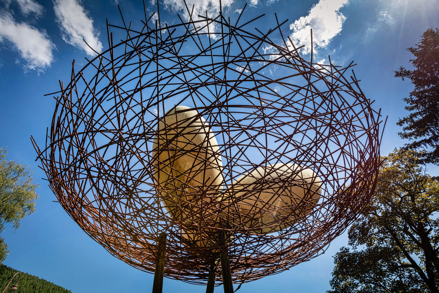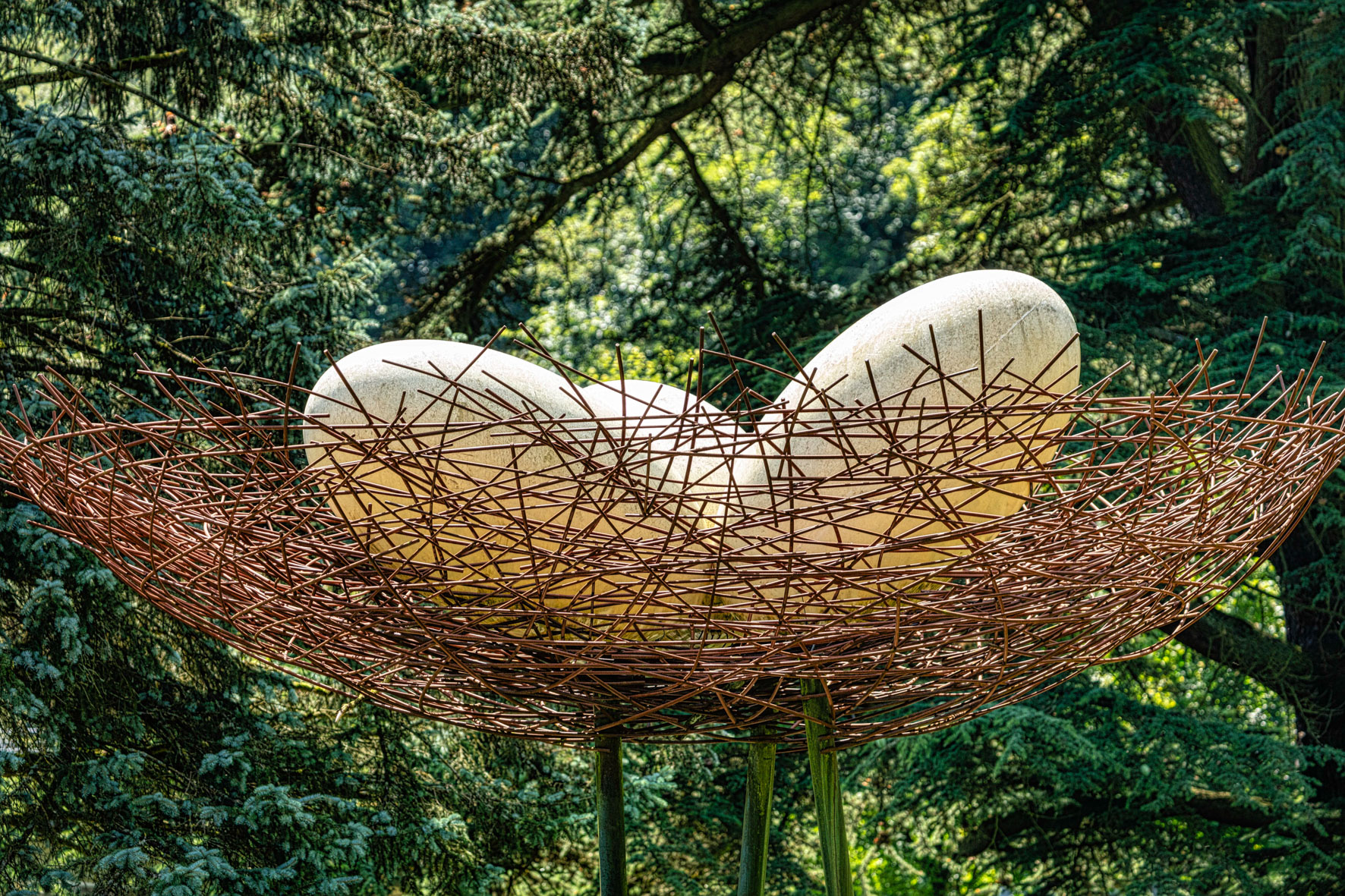 À la fois dur et fragile, l’œuf matérialise le creuset dans lequel se développe la vie et dont il faut briser la coquille pour que l’oiseau, ou l’idée prenne son envol. Forme parfaite et singulière, elle est nimbée de mystère, le moindre n’étant pas celui de la question irrésolue et inévitable de la préséance de l’œuf ou de la poule.