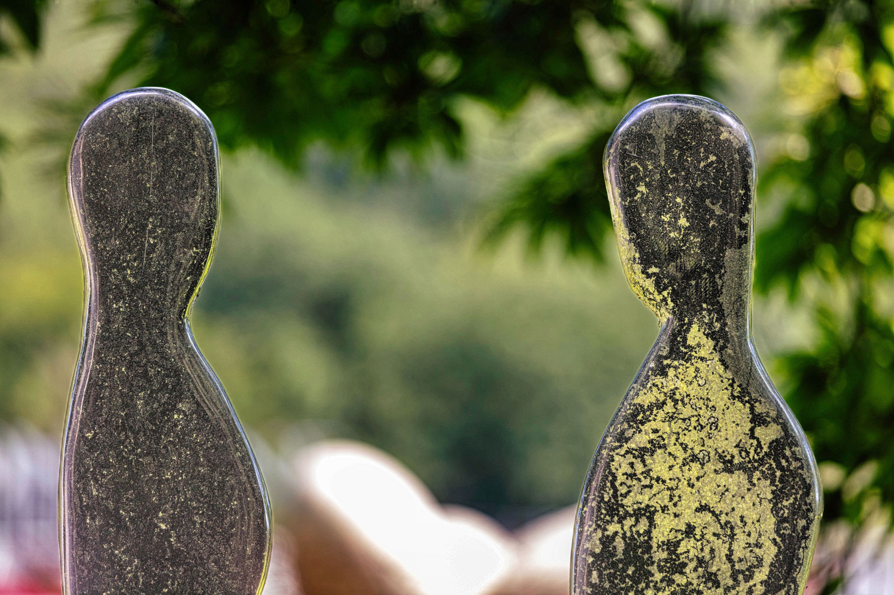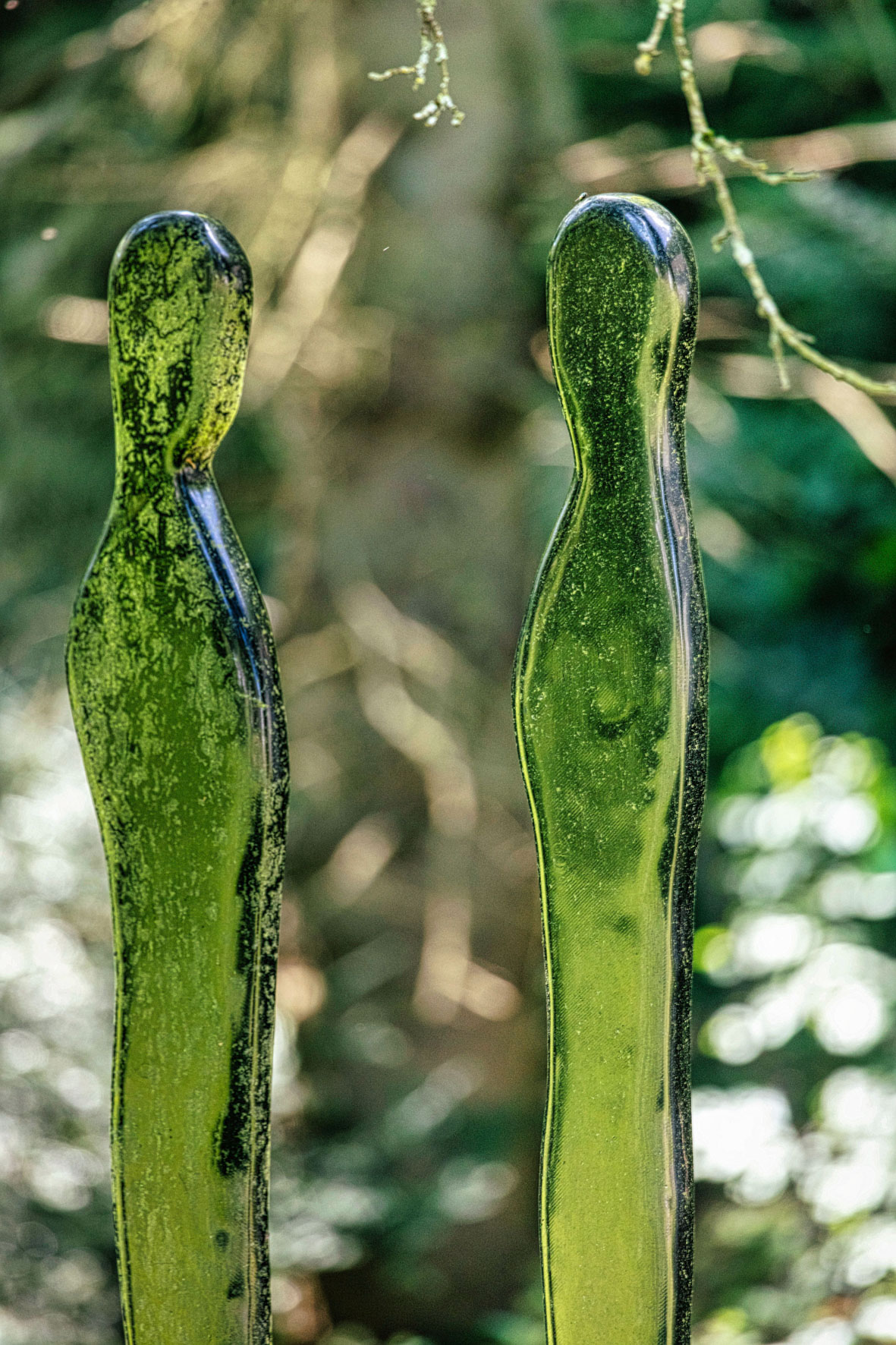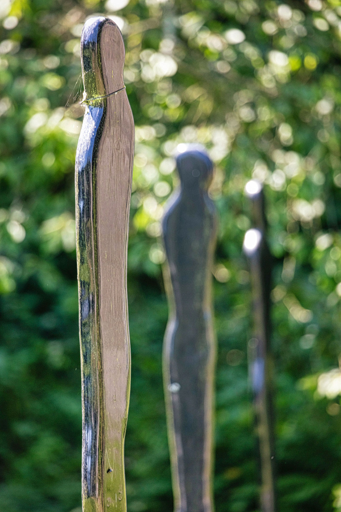 Nous est une installation de silhouettes abstraites en errance. Chaque silhouette reflète l'espace environnant et vient s'insérer dans la Nature jusqu'à, par moment, quasiment disparaître.