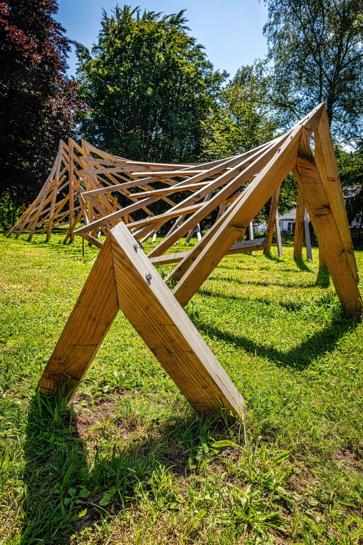 Au cœur d’une vallée creusée en ‘V’, dans une ville thermale, l’évocation de l’élément eau semble naturelle. En alchimie, celui-ci étant représenté par un triangle dirigé vers le bas, la forme élémentaire de l’installation apparaît, graphique, stable et équilibrée.