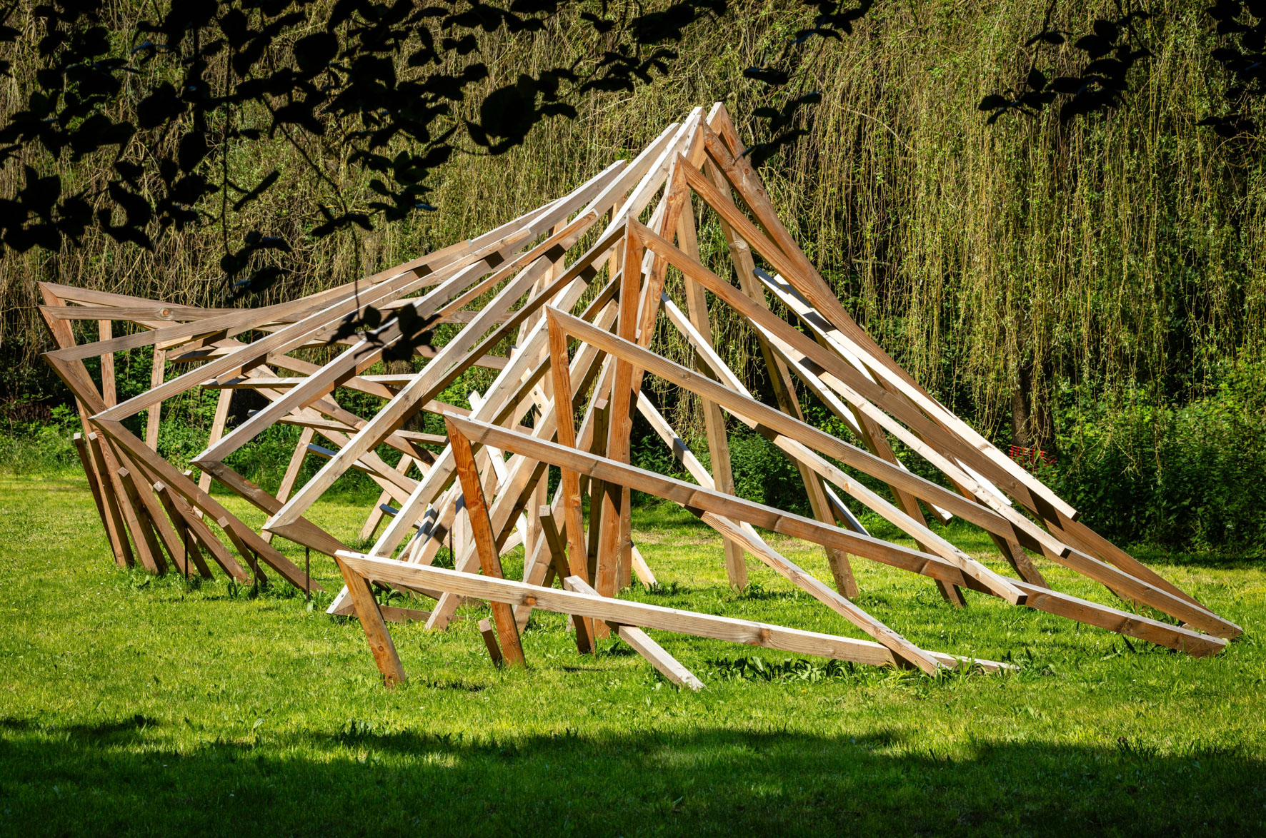 Dans cette œuvre située à côté d’une rivière, les notions de temporalité et de déplacement sont omniprésentes. Elles sont ici matérialisées en jouant sur la répétition et la rotation de cette forme de base.